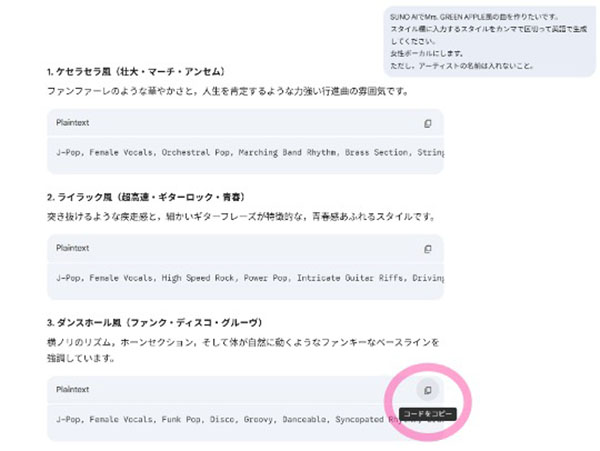 こうすると、AIがそのアーティストの曲調の特徴(テンポ,楽器,雰囲気など)を分析し、生成AIに伝わる最適な言葉に変換してくれます。小学生にとっては、女性ボーカルの曲の方が圧倒的に歌いやすいものです。また、Suno AIのスタイル欄に具体的なアーティスト名を入れてしまうと、著作権保護のため生成されない場合もあるため、最後の一文を入れておくことは重要です。
