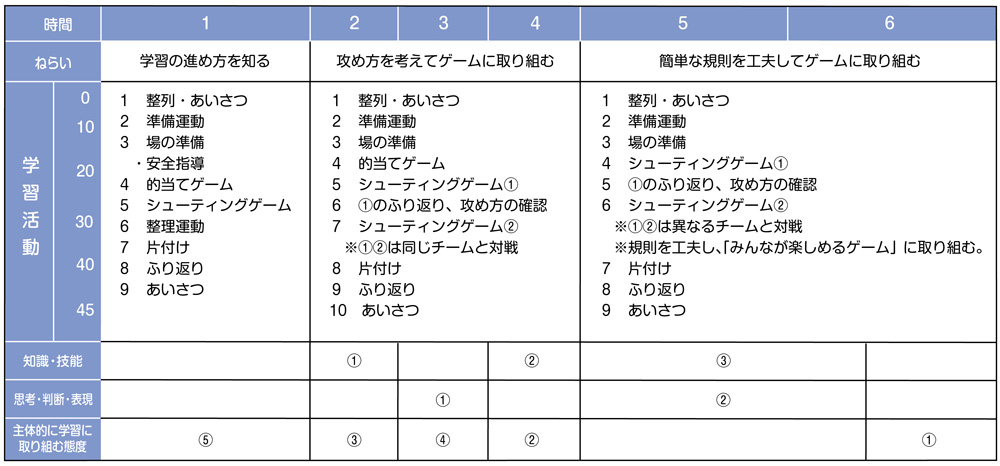 ボールゲームでは、簡単なボール操作と攻めや守りの動きによって、易しいゲームをする楽しさに触れることができるようにします。今回は、ボールを“ねらったところに投げる”操作とし、発展的に“蹴る”操作も見通していきます。ボールゲームを楽しく行うために、“勝っても負けてもみんなが楽しいゲーム”になるようにクラス全員で話し合って規則を選び、それを守る経験を積み重ねます。チームで攻め方を考え、たくさん得点するために協力することを身に付けていきます。