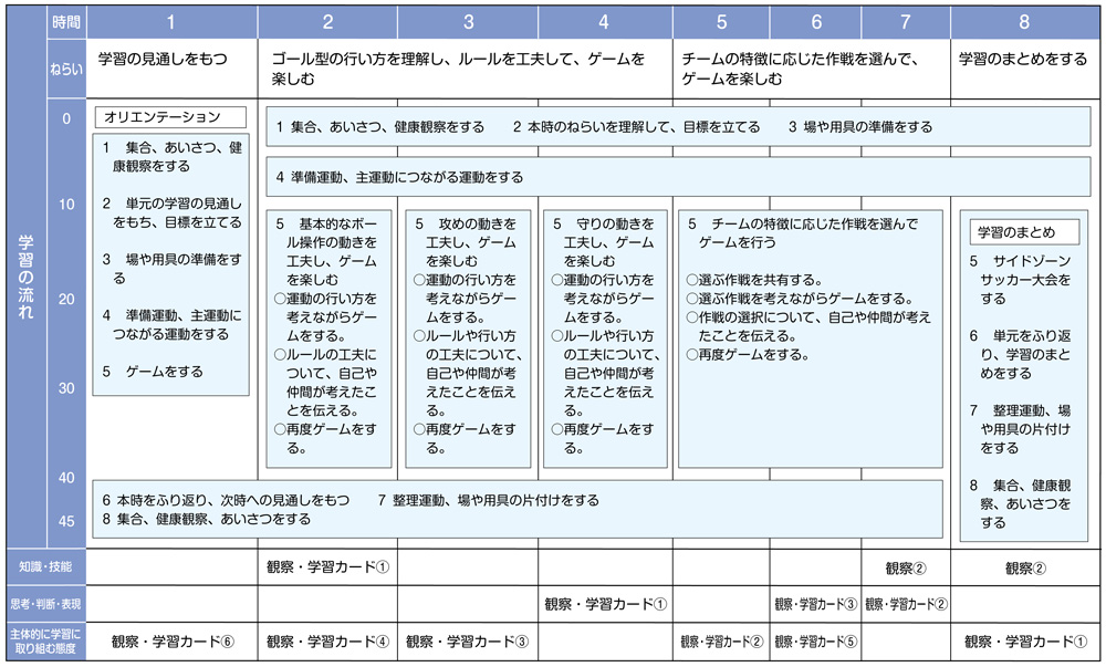 ゴール型(サッカー)に積極的に取り組み、ルールを守り助け合って運動をしたり、勝敗を受け入れたり、仲間の考えや取組を認めたり、場や用具の安全に気を配ったりすることができるようにする。