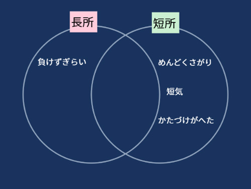 そこで、自分の長所に意識的に目を向けるために、シンキングツールの「ベン図」を用いて長所と短所を書き出す活動を取り入れました。漠然と「長所はあるか」と問うよりも、言葉にして整理する時間を確保することで、自己理解が深まると考えたためです。