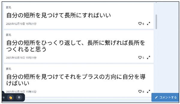 授業の終末に、めあてに対する自分の考えをまとめる場面では、その日の学習を振り返って言葉にできることが理想です。しかし、実際には、考えがあっても言葉にするのが難しく、なかなか書き始められない子供もいます。そこで、「長所を見つけたり伸ばしたりするには、どのような考えが大切か」という問いを提示し、LiveQのコメント欄に自由に記入できるようにしました。
