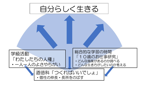さらに、総合的な学習の時間「10歳のお仕事研究」では、家族や友達から見える自分のよさを聞いたり、自分の関心のある職業を調べたりする体験活動を位置付けています。これらの活動を関連付けることで、子供たちが自分らしさに出合い、自分の可能性を広げていくことを目指しました。