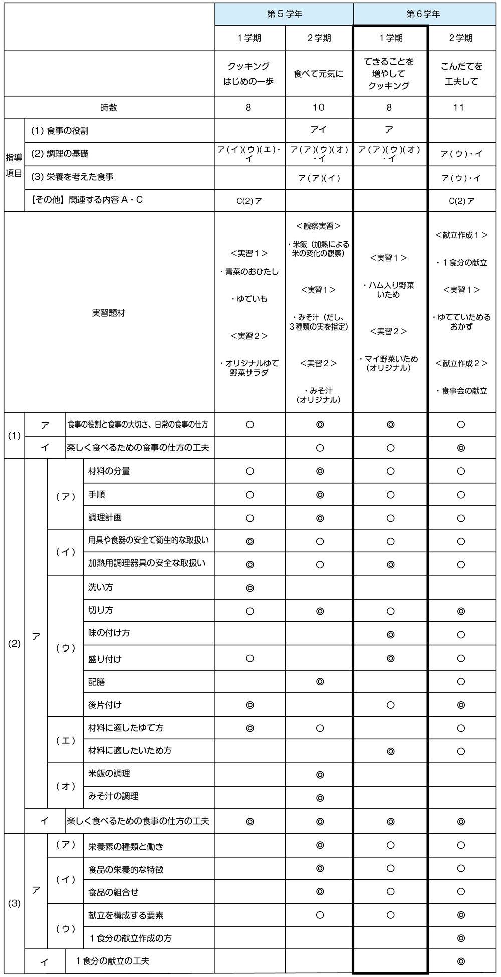 〇朝食の大切さが分かるとともに、加熱用調理器具の安全な取扱い、調理に適した味の付け方、盛り付け、材料に適したいため方について理解し、それらに係る技能を身に付ける。