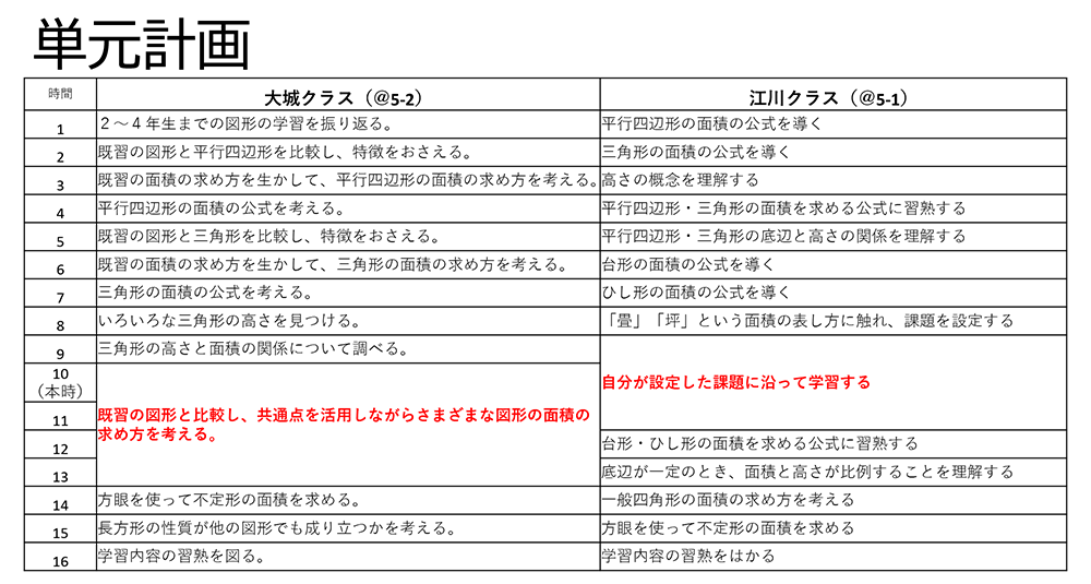 5年生の実態として、算数への意欲はあるものの、学力差が大きく、同じ授業の中で手が止まってしまう子供の姿も見られました。そうした中で、大城先生は「1つでもわかった、できたという経験を積ませたい」という願いをもって、算数少人数指導教諭の江川先生とともに単元計画を検討していきました。