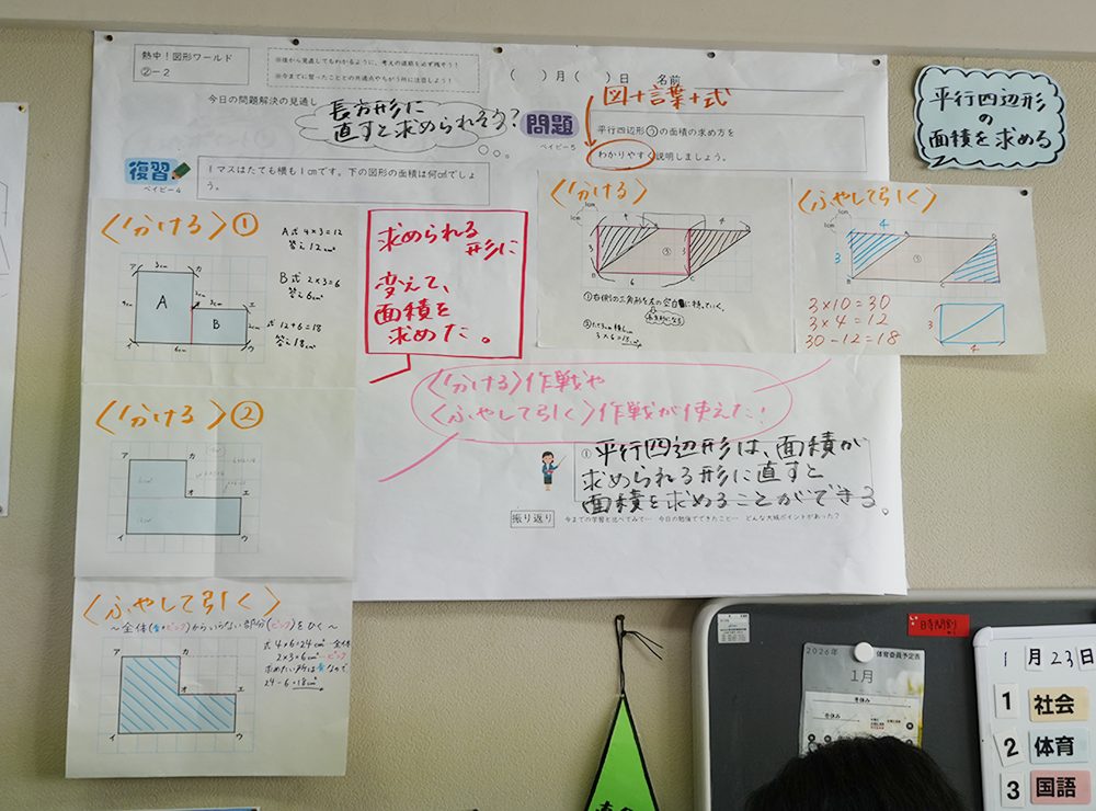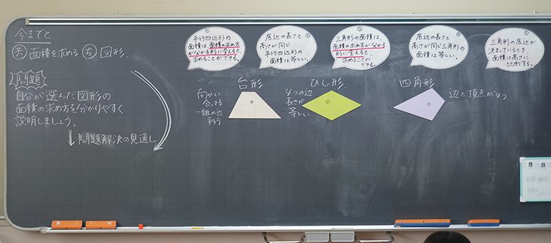 授業のはじめに大城先生が行ったのは、前時までの学習と本時の課題を比べることでした。次の問いかけをきっかけに、子供たちはこれまでに学習した平行四辺形や三角形の面積の求め方を思い出していきます。