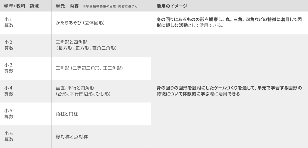 本プログラムの大きな特長は、教科単元に紐づいており、普段の授業に取り入れていただきやすい点にあります。とくに、小学校1年生~6年生の算数と連動して、思考・判断・表現力を育むプロセスを実践できます。