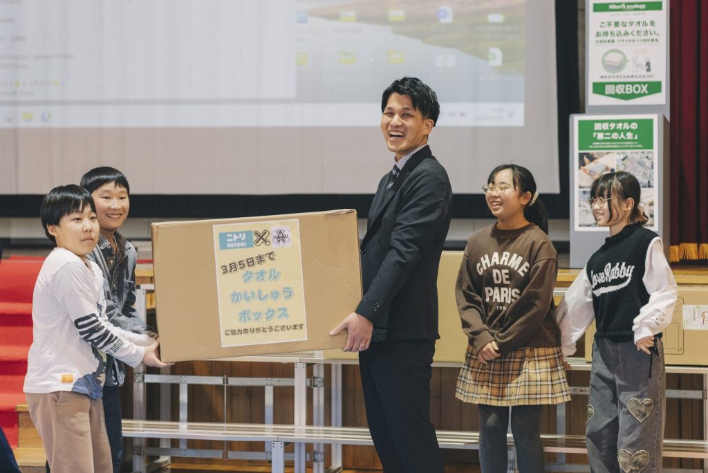 全校に呼びかけて集めたタオルは、段ボール2箱分、合計23kg、134枚。代表の子どもはニトリ社員にタオルを手渡しながら「僕たちが使ってきたタオルを134枚集めました。思いがこもっているから重さは100kgです。タオルの第二の人生をよろしくお願いします」と語りました。