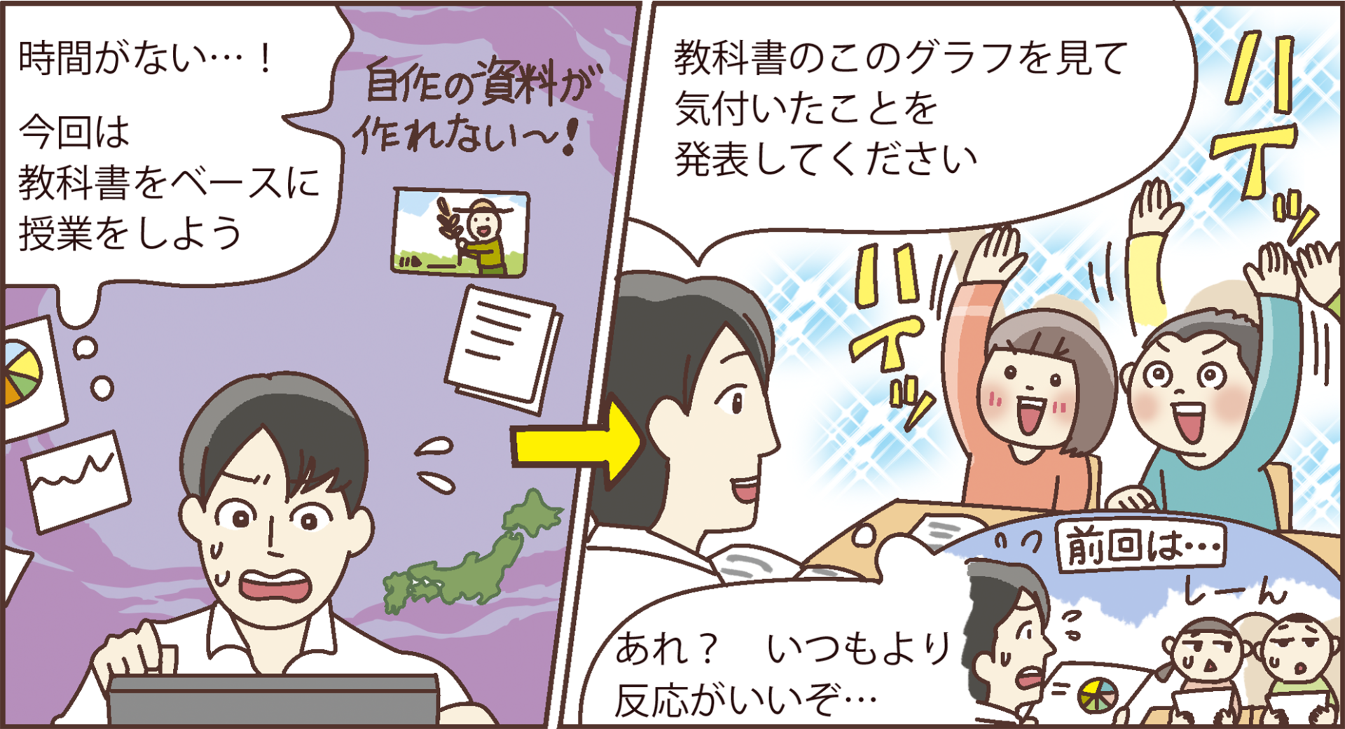 そこで、とりあえず教科書の資料をうまく活用しながら、教科書に沿った授業をすることにしたのです。用意できたのは、自治体のデータくらい。教科書の内容9割に対し、自作の資料は1割程度でした。