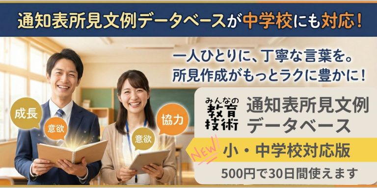 みん教の通知表所見文例データベースが中学校にも対応!一人ひとりの児童生徒に寄り添った所見作成を、より豊かな表現で、より効率的に